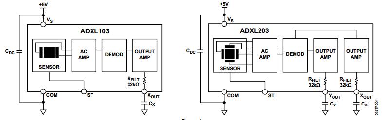 The ADXL203CE is a dual-axis accelerometer. Its applications include Vehicle dynamic controls, Electronic chassis controls, Platform stabilization/leveling, Navigation, Alarms and motion detectors, High accuracy, 2-axis tilt sensing.