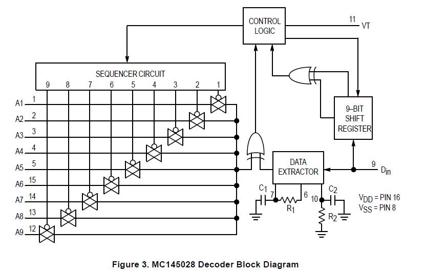 The MC145028P is a 9 Line decoder. It is designed to be used as encoder/decoder pairs in remote control applications. The MC145028P treats all nine trinary digits as an address which allows 19,683 codes. If binary data is encoded, 512 codes are possible. The VT output goes high on the MC145028P when two addresses are consecutively received (in one encoding sequence) which both match the local address.