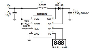 MIC4827BMM features: (1)1.8V to 5.5V DC input voltage; (2)180V PP regulated AC output waveform; (3)Independently adjustable EL lamp frequency; (4)Independently adjustable boost converter frequency; (5)0.1µA shutdown current.